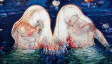 Ici, une petite voiture. Là, une corde de pendu. Un ver, un insecte. Une minuscule pierre tombale. Là, des saucisses. Beaucoup de saucisses. Et parfois, des corps adultes, souvent camouflés sous des drapés, aux froissés finement dessinés. Si les figures enfantines sont visibles, centrales, et nous observent avec une insolente insistance, les êtres matures se cachent derrières des masques, sous des tissus soigneusement plissés. Drôles d’invités dans cette bacchanale enfantine, ils prennent la pose comme pour une photographie de famille brisée, au cœur d’une maison hantée. Cachés, dissimulés, ces clandestins nous troublent, par leur simple présence. Comme s’ils n’étaient pas censés être là. Les protagonistes de l’accumulation alentour ont d’ailleurs davantage d’essence, d’aura, de matérialité. Ne restent alors de ces personnages dépourvus d’identités que des morceaux succins, des fragments de peau, de la vie conjugale. Dans les œuvres, toutefois, rien n’est jamais vulgaire ou brutal – pas même la nudité ou les gestuelles ambiguës. Tous les enjeux se situent à un autre niveau, plus souterrain, certes rempli de confettis et autres joyeuses banderoles, mais pourtant spectral et déchirant.